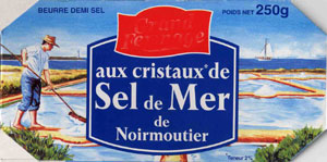Commentaire apposé au verso de l'emballage : "Ah, le plaisir du petit grain de sel qui fond sur la langue ! Pour vous offrir cette délicieuse sensation, Gxxxx Fxxxx parsème son beurre au sel de mer de Noirmoutier de ces petits grains d'océan, récoltés à la main par les sauniers sur l'île de Noirmoutier, selon une méthode traditionnelle. Tout le caractère marin du sel de Noirmoutier est ansi préservé et donne au beurre Gxxxx Fxxxx, au goût de crème, sa saveur à redécouvrir chaque jour ..." Labelliser et certifier des sels :www.cannelle.com/LABO/produits/excellence/sels.shtml |