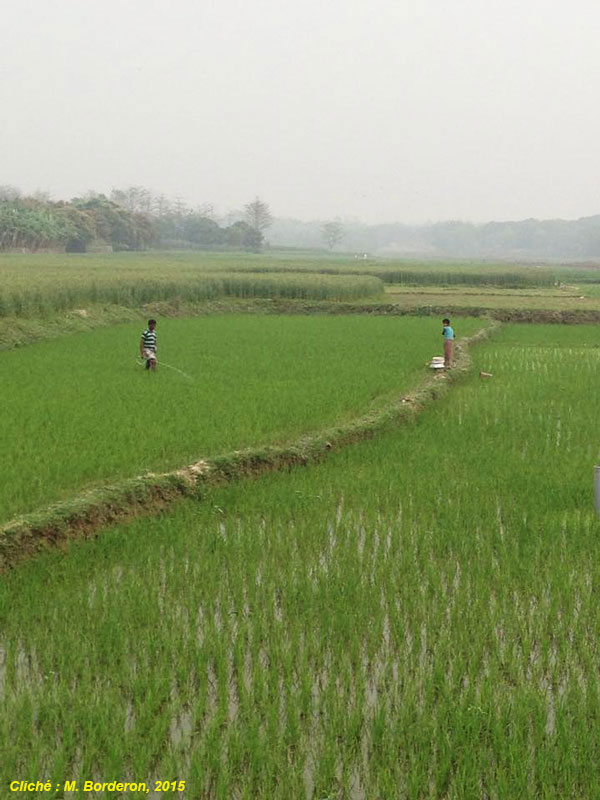 Cliché : Marion Borderon, février 2015. Bien qu’en saison sèche, une culture de riz a été repiquée depuis deux mois, grâce à l’irrigation. La rizière est intégrée à une combinaison de cultures (au second plan, canne à sucre et champ en jachère préparé pour une culture de riz dans une autre saison). Un petit outillage agricole moderne est utilisé, notamment pour un épandage. La densité de population est supérieure à 1 000 h/km² dans cette région du Bengale occidental (district de Maldah). Source : François Durand-Dastès, « Les hautes densités démographiques de l'Inde », Géoconfluences, mars 2015. |
