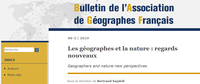- Bertrand Sajaloli (dir.), « Les géographes et la nature : regards nouveaux », Bulletin de l’Association des Géographes Français, 96-2 | 2019.