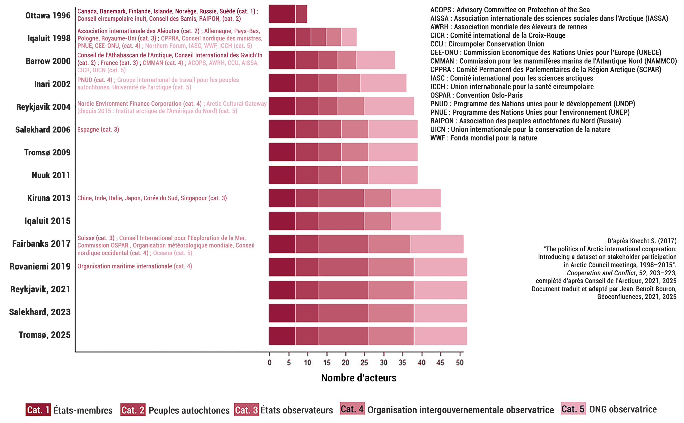 D’après Knecht S. (2017), complété d'après Conseil de l'Arctique pour les années 2017 et 2019. Traduit et adapté par Géoconfluences, 2021. Mis à jour en 2025.