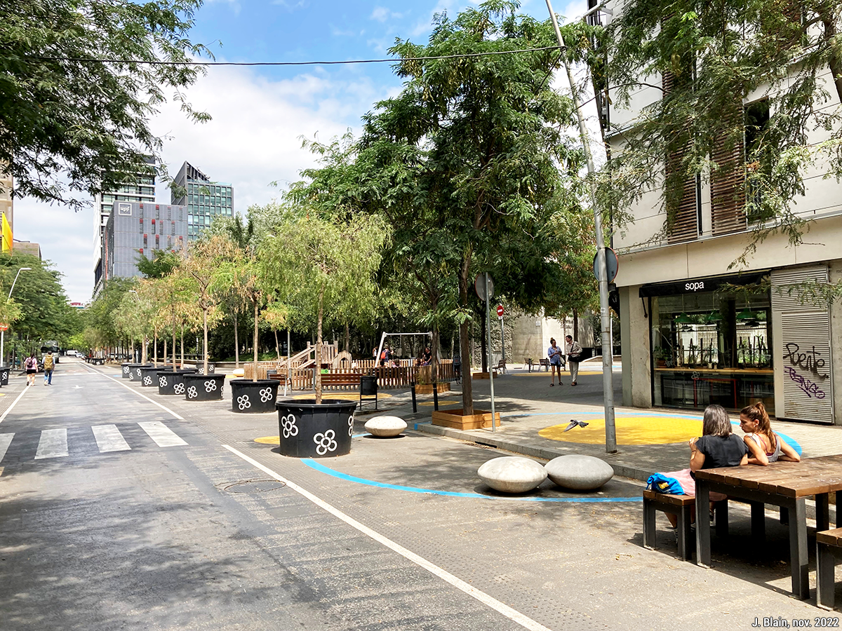 Espaces publics réaménagés et végétalisation d'une rue soustraite à l'automobile à Barcelone (Espagne)