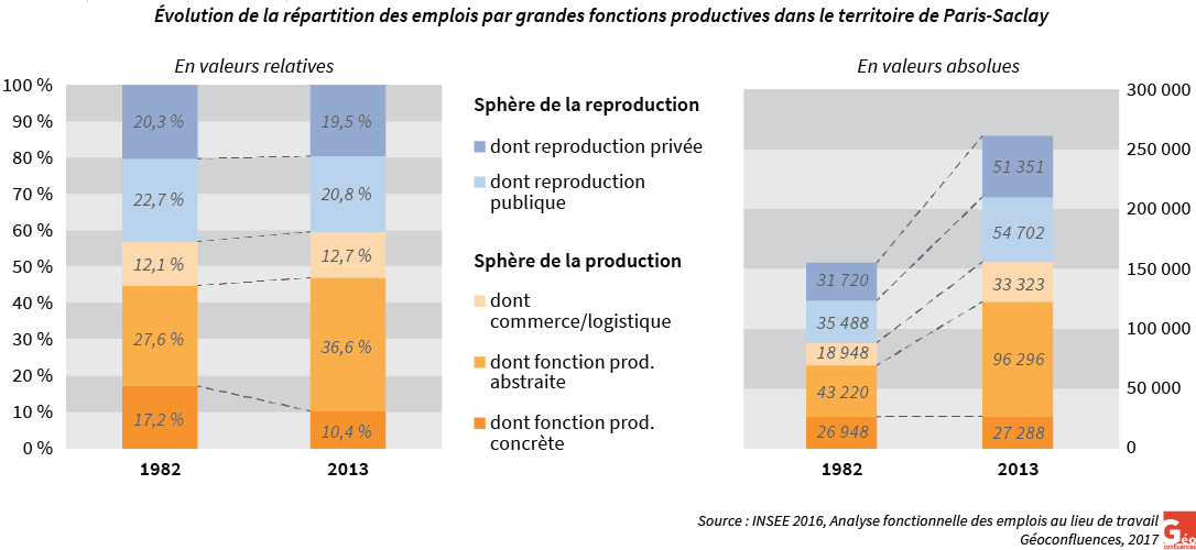Evolution de la répartition des emplois par grandes fonctions productives dans le territoire de Paris-Saclay