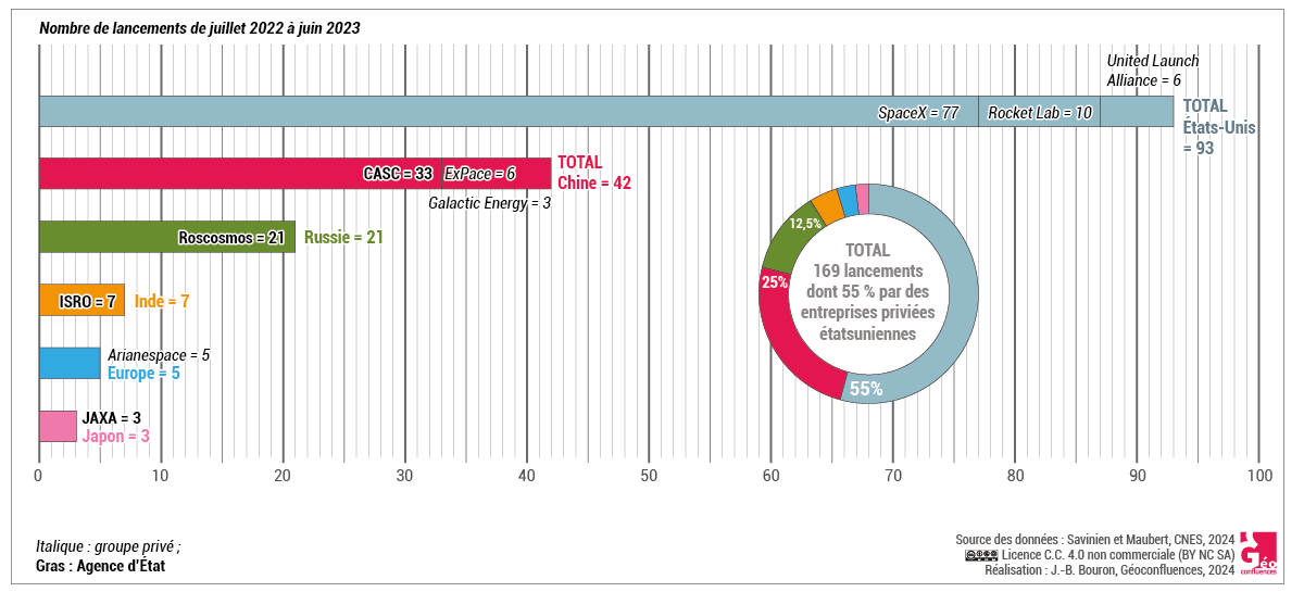 Nombre de lancements par pays, y compris entreprises privées, de juillet 2022 à juin 2023