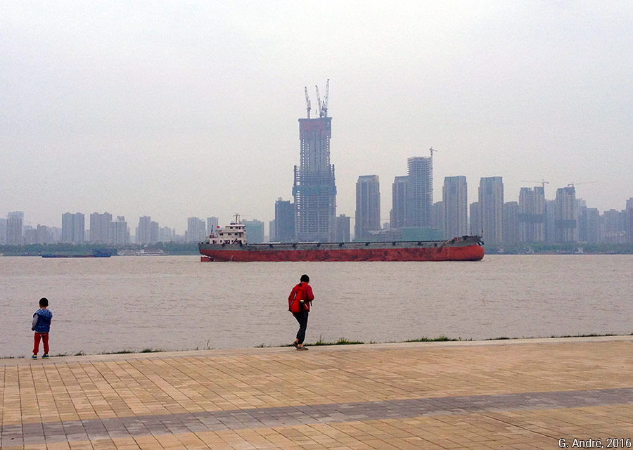 Transition urbaine : le quartier d'affaires de Wuchang en construction vu depuis la rive gauche du fleuve Yangzi (Wuhan, Chine)