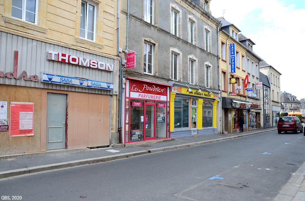 Rue commerçante avec commerces vacants à Isigny-sur-Mer (Normandie)