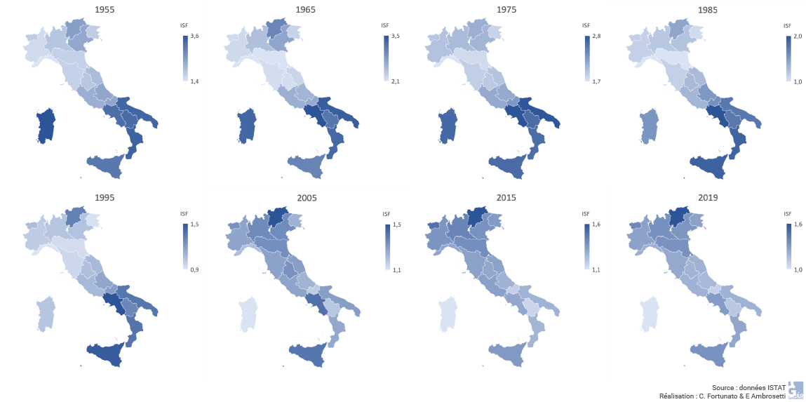 Évolution de l'indice synthétique de fécondité par région (aux frontières actuelles), 1955-2019 (Italie)
