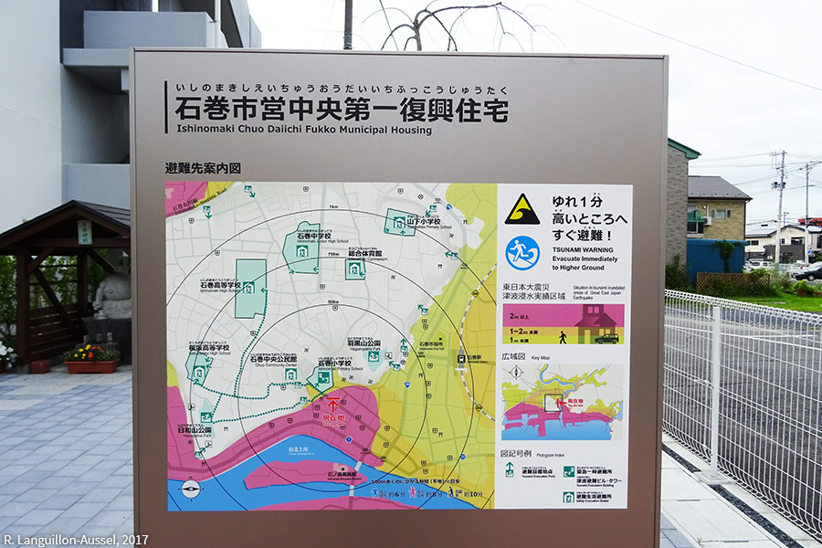 Panneau explicatif de l'avancée du tsunami de mars 2011 dans la ville côtière d'Ishinomaki