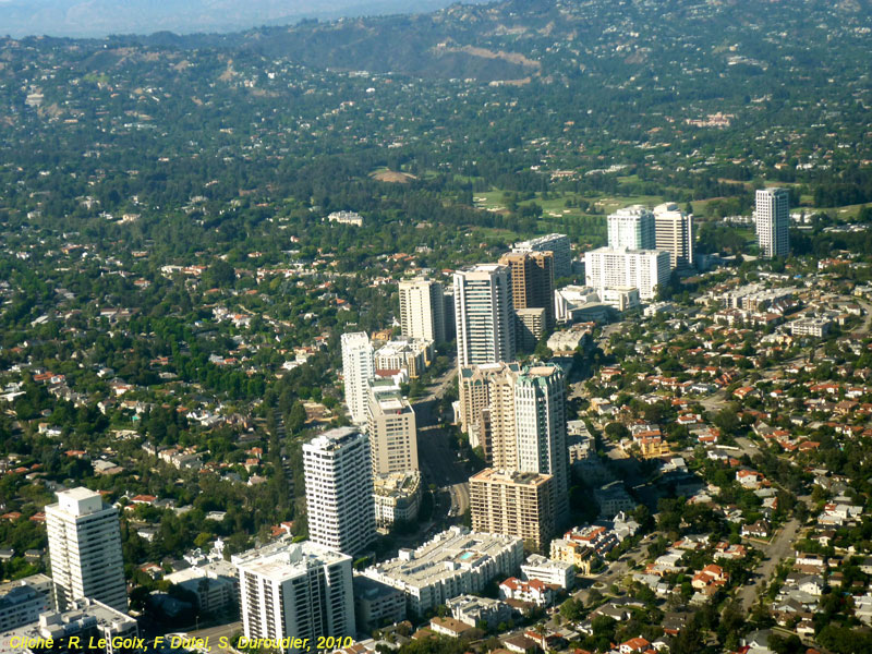 2. Complexes résidentiels ou condominiums le long de Wilshire BdAu centre, le long de l'axe qui relie Santa Monica au downtown en passant par West Hollywood, non loin du campus de UCLA (hors champ, sur la gauche de l’image), une série de complexes résidentiels ou condominums, participe des quartiers centraux stables, aux densités élevées, habités par des jeunes et des locataires. |