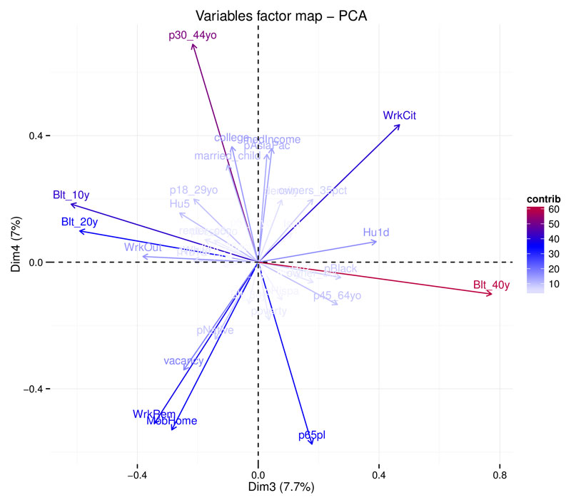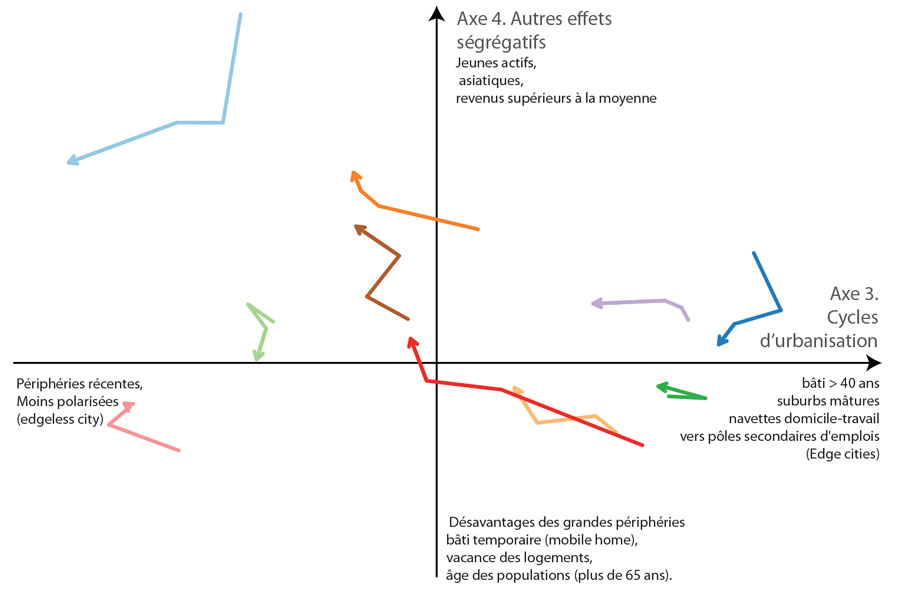 Le troisième facteur met en évidence les cycles d’urbanisation, et distingue d’une part des espaces où le bâti a été produit quatre décennies ou plus avant le recensement, avec une surreprésentation des maisons individuelles, mais aussi – effet de la maturité – des navettes domicile-travail structurées par les pôles centraux et pôles secondaires d’emplois ; et d’autre part des zones de périphéries plus récentes, plus dépendantes d’une structure moins polarisée de l’emploi (navettes à plus grande portée, dans le reste de la MSA ou en dehors). Le dernier axe d’interprétation rend compte d’effets ségrégatifs non pris en compte par les axes précédents, toutes choses égales par ailleurs. On observe d’une part un couplage entre les jeunes actifs, les lieux de résidence dont les pôles d’emplois sont des centres principaux et secondaires, avec les Asiatiques, ayant eu accès à l’enseignement supérieur et aux revenus supérieurs à la moyenne. D’autre part des espaces marginaux cumulent les désavantages de l’éloignement géographique, le bâti temporaire (mobil-home), la vacance des logements et l’âge des populations (plus de 65 ans).