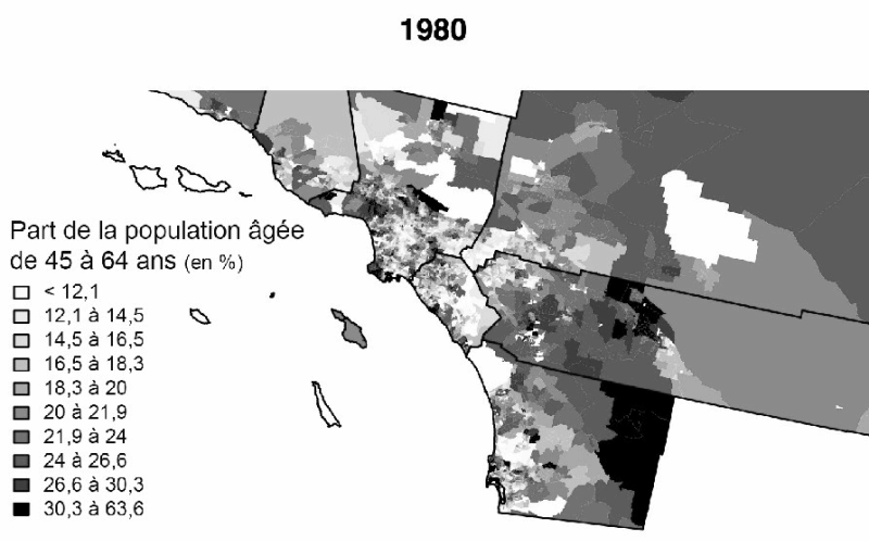 Le vieillissement de la population contribue également fortement aux reconfigurations en cours : la part des 18 à 29 ans a fortement diminué en 30 ans (de 22,6 à 17,3 %), avec une oscillation des 30-44 ans, qui représentaient 20 % en 1980, 25 % en 1990 et à nouveau 20,8 % de la population en 2010. De plus, la distribution spatiale de ces adultes tend à se resserrer, au détriment des zones les plus périphériques où ils sont relativement moins présents. C’est en effet la proportion des plus de 45 ans qui, mécaniquement dans une période de fléchissement du solde migratoire de la Californie, augmente de manière très sensible : les 45-64 ans représentent 19,4 % de la population en 1980, et 25 % en 2010 ; les plus de 65 ans passent quant à eux de 10,5 à 11,6 %. C’est donc un changement de structure spatiale d’ampleur qui semble s’opérer, où plusieurs composantes agissent conjointement : un vieillissement global de la population, ainsi qu’une dispersion spatiale accrue des personnes de plus de 45 ans, qui contribue à une plus grande homogénéité entre les unités spatiales.