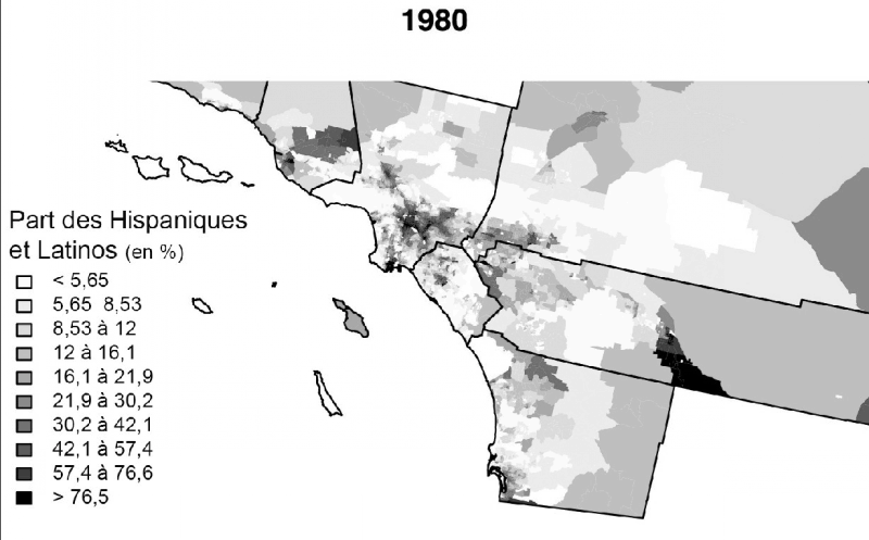 Ces travaux interrogent indirectement le rôle de l’immigration récente dans la reconfiguration socio-spatiale des métropoles américaines telles que Los Angeles : les processus qui sous-tendent les localisations résidentielles sont très différents de ceux qui ont dans l’histoire discriminé les Noirs des Blancs. La force des réseaux migratoires tend à renforcer dans un premier temps les regroupements communautaires (Allen et Turner, 2002) ; mais la réussite sociale d’immigrants peut les inciter à choisir ensuite d’autres quartiers, selon des processus d’assimilation spatiale ou d’hétérolocalisme - la communauté, structurée en réseau se maintient malgré la forte dispersion spatiale du groupe - (Zelinsky et Lee, 1998 ; Wright et Ellis, 2000). Cette structuration réticulaire d’une communauté à la fois dispersée mais disposant également de quartiers et de lieux de références, de pratiques collectives occasionnelles, de lieux de mémoire, a été développée par Mekdjian (2009) dans le cas des Arméniens à Los Angeles. Quant aux ménages mixtes, ils préfèrent les quartiers à la composition variée (Holloway et al., 2005, p. 321). Ces processus favorisent les situations d’entre-deux, de non-exclusivité ethnique des quartiers.