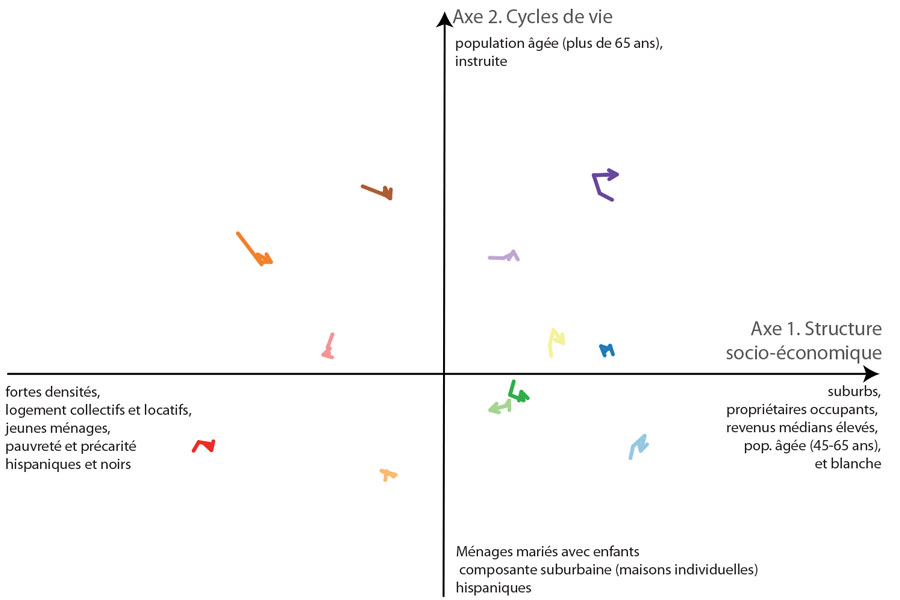 Les choix méthodologiques opérés conduisent à traiter conjointement deux dimensions du changement : comment évoluent les types de quartiers les uns par rapport aux autres, et comment se distribuent les principales dimensions globales des mutations métropolitaines (structure socio-économique, cycle de vie, cycles d’urbanisation, ségrégation). Ainsi, pour chaque type de quartier qui a été déterminé par l’analyse multivariée, on décompose la position relative de celui-ci, pour chaque recensement, par rapport à la position de variables. La représentation des profils par des flèches, sont l'expression du changement moyen qui affecte, toutes choses égales par ailleurs, des types de quartiers (pour en savoir plus sur la méthodologie, voir le complément 1).