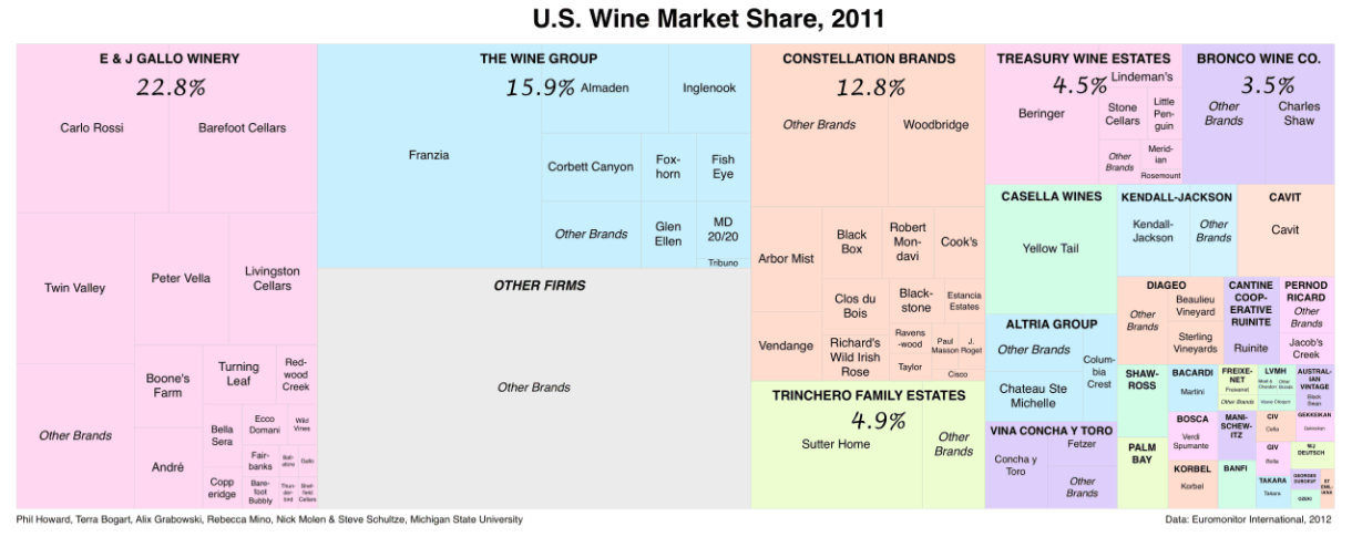 Firmes et marques dans le marché du vin américainSource : P. Howard et al., Concentration in the U.S. Wine Industry, Université de l'État du Michigan, 2012. La taille de l'établissement est à l'échelle de son rang de première winery mondiale, et de premier exportateur de vins californiens. |