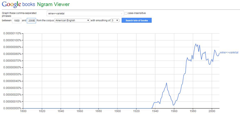 Évolution de l'occurence du mot "varietal" (cépage) dans un corpus d'ouvrages américains (1800-2000)Source : Google Ngram |
