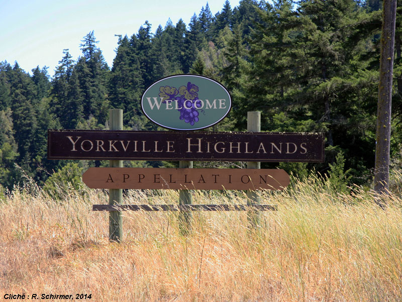 L'AVA Yorkville Highlands (Comté de Mendocino)Panneau indiquant l’entrée dans l’AVA Yorkville Highlands. Seule l’altitude différencie ces « highlands » du reste de l’AVA Mendocino (voir le texte officiel en .pdf de délimitation de l'AVA Yorkville Highlands datant de 1998). Une appellation sous-régionale française reposerait sur toute une batterie de critères qualitatifs. |