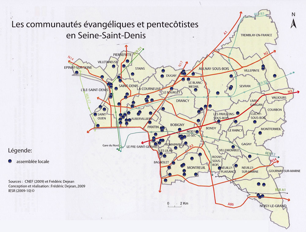Localisation des communautés évangéliques et pentecôtistes en Seine-Saint-Denis en 2009