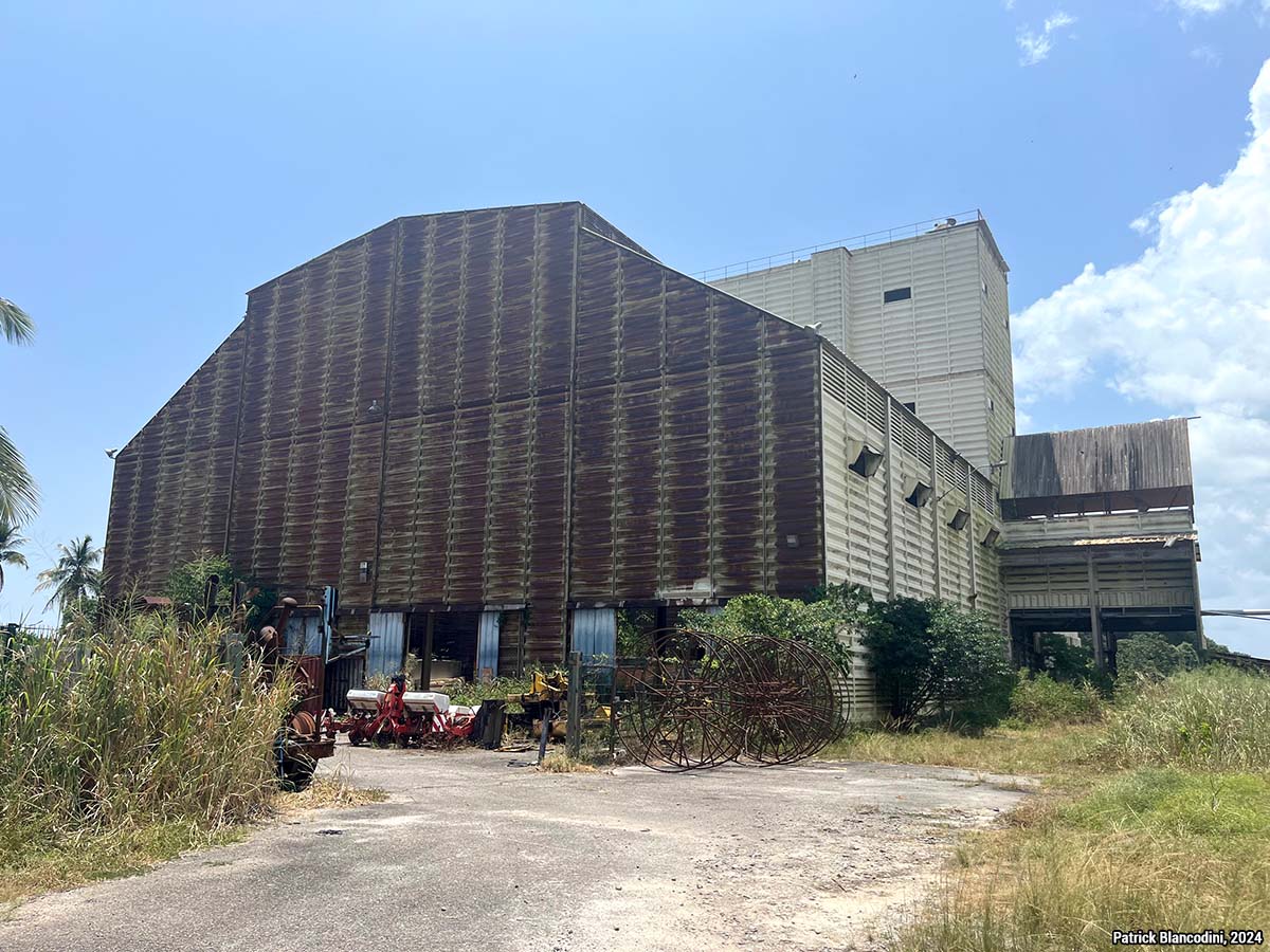 Entrepôt de matériel agricole à l’abandon et usine de traitement du riz des années 1990-2000. Cliché : Patrick Blancodini, août 2024. |