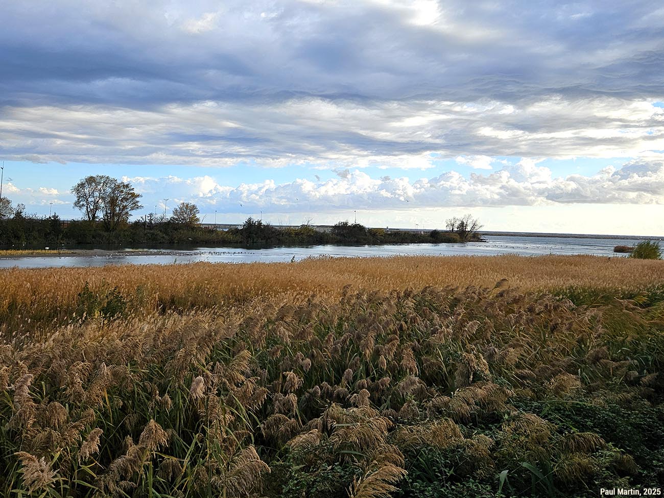 Document 1. L’embouchure du Var depuis la rive droite. Au premier plan, les roselières de la zone humide. Au deuxième plan, le lit du Var avec ses gravières et son lit mineur. On voit nettement à l’arrière-plan les bâtiments tout proches de l’aéroport de Nice, troisième aéroport français pour le trafic passager derrière Roissy et Orly. Cliché de Paul Martin, décembre 2025.